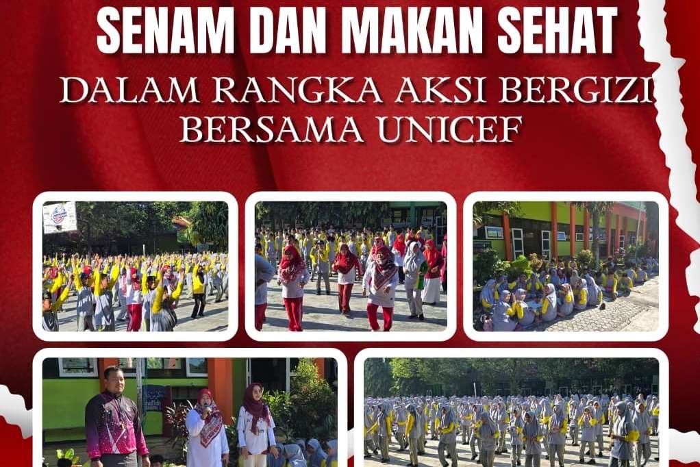 Jember (Humas MTsN 2 Jember) – Suasana cerah Rabu pagi (27/8) pukul 07.00 WIB menjadi saksi antusiasme seluruh civitas akademik MTsN 2 Jember yang tumpah ruah di lapangan madrasah. Civitas akademik yang terdiri atas 750 siswa, 57 guru/ karyawan dan kepala madrasah mengikuti kegiatan Senam dan Makan Sehat menjadi agenda unggulan madrasah. Momen senam sehat bersama ini merupakan implementasi program Pemerintah Republik Indonesia bekerja sama dengan UNICEF yang dapat mendekatkan hubungan antara siswa dengan guru, karyawan, maupun kepala madrasah.