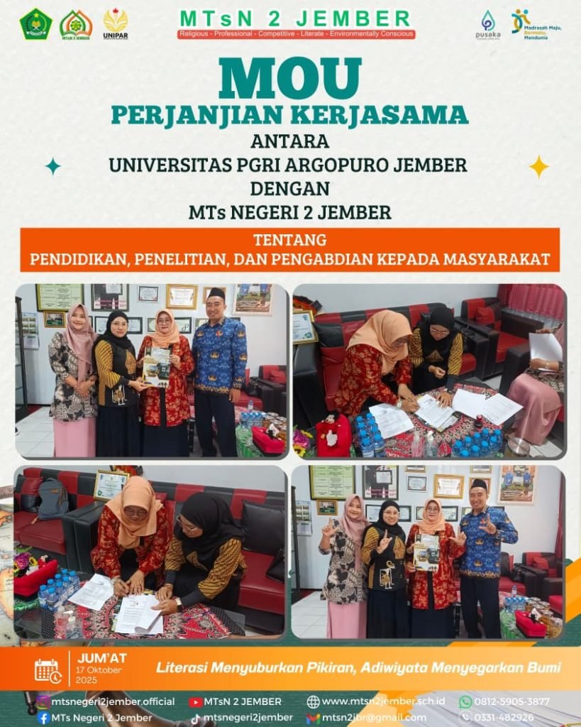 MoU Perjanjian Kerjasama antara Universitas PGRI Argopuro Jember dengan MTs Negeri 2 Jember tentang Pendidikan, Penelitian, dan Pengabdian kepada Masyarakat Post author:MTsN 2 Jember | Admin Post published:October 17, 2025 Post category:Artikel Post comments:0 Comments Share my story Share this content Opens in a new window Opens in a new window Opens in a new window Opens in a new window You Might Also Like Buletin Martsanda October 30, 2022 CINTA LOKASI BERSEMI October 25, 2022 Leave a Reply Cancel replyCommentEnter your name or username to comment Enter your email address to comment Enter your website URL (optional) Save my name, email, and website in this browser for the next time I comment. Δ