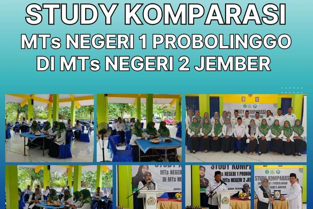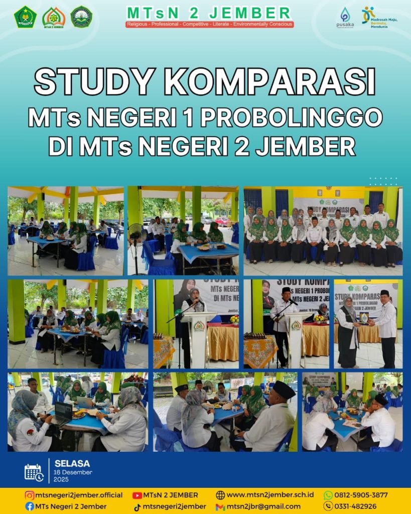 Jember (Humas MTsN 2 Jember) – Suasana pagi tampak berbeda, seluruh civitas akademik MTsN 2 Jember tampak berjejer rapi menyambut tamu kehormatan dari MTsN 1 Probolinggo. Pada pukul 9.30 WIB dua mobil tampak parkir di depan gerbang madrasah untuk menurunkan beberapa sosok penting dari salah satu madrasah tertua di Jawa Timur yang sebelumnya dikenal dengan MTsN Karanganyar Paiton, kini berganti dengan MTsN 1 Probolinggo (MatsaPro). Tak hanya diikuti oleh kepala MTsN 1 Probolinggo (Muhammad Sugianto, M.Pd.I) dengan didampingi Wakil Kepala Bidang Kurikulum, Kepala Perpustakaan, Koordinator Literasi, Koordinator Adiwiyata, tetapi juga Kepala MTsN 2 Jember, Waka Kesiswaan, Tim dan duta Literasi, tim Adiwiyata, tim Pengurus Perpustakaan madrasah, dan guru dalam rangka kegiatan studi tiru atau studi komparasi pada Selasa (16/12/2025). Kegiatan yang berlangsung di Aula MTsN 2 Jember ini bertujuan untuk meningkatkan kualitas layanan pendidikan, khususnya pada bidang perpustakaan, madrasah literasi, dan program adiwiyata.